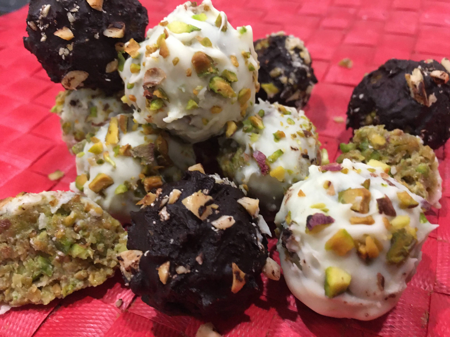 - Derrite en el microondas los chocolates y trocea unos pistachos para bañar las bolitas. ¡Listo!.